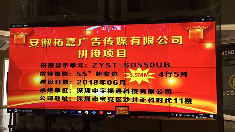 安徽九鼎傳媒有限公司此次選用中宇視通科技55寸4行5列3.5mm拼縫拼接屏項目,項目順利安裝調試完成,并且此次九鼎傳媒還會與中宇視通達成深切合作及達成長期戰略合作。