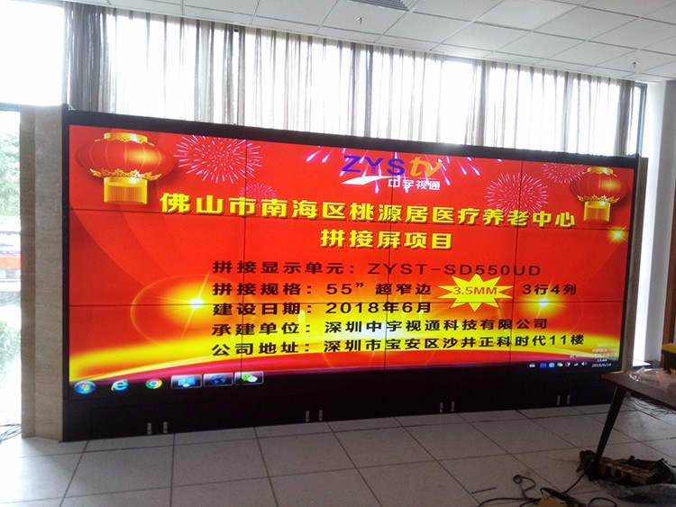 佛山市南海區(qū)桃源居醫(yī)療養(yǎng)老中心拼接屏項(xiàng)目選擇中宇視通55寸3.5mm拼縫3行*4利12片液晶拼接屏,項(xiàng)目順利完成調(diào)試。