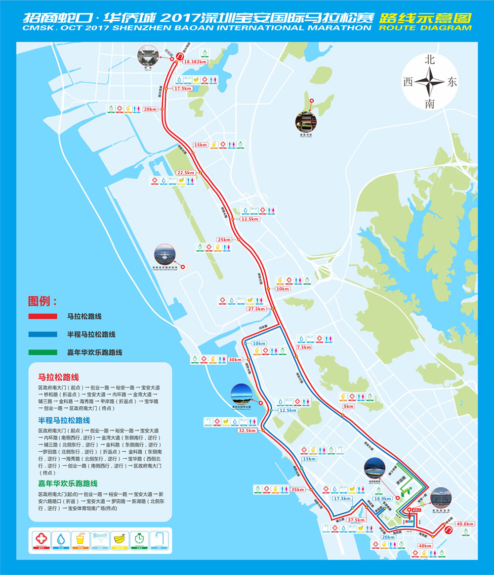 (一)起點:寶安區政府南大門; 馬拉松、半程馬拉松終點:寶安區政府南大門; 嘉年華歡樂跑終點:寶安體育館南廣場;