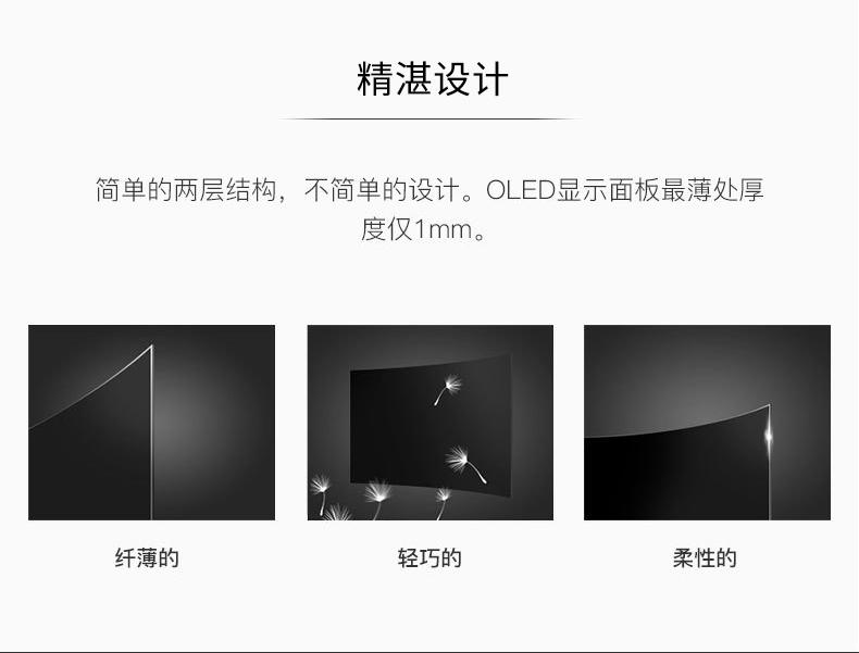 產品特點:OLED曲面拼接屏具有輕薄如紙、可彎曲的特點。可根據空間設計各種曲度造型,節約空間;一體化的產品,可完美融入環境;完美的色彩顯示、優雅的曲面設計,吸引客戶的眼球。