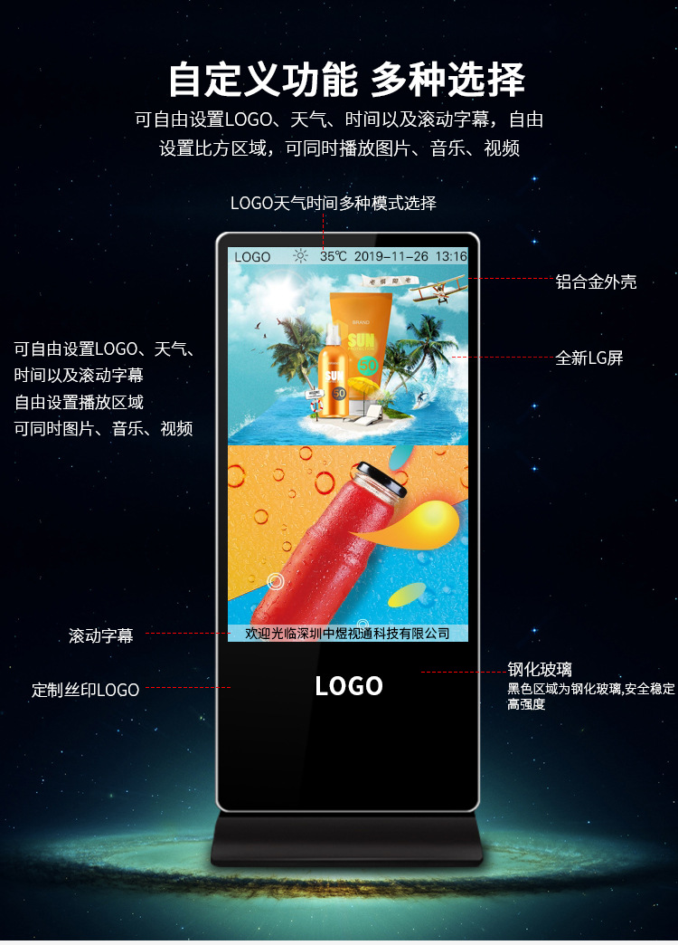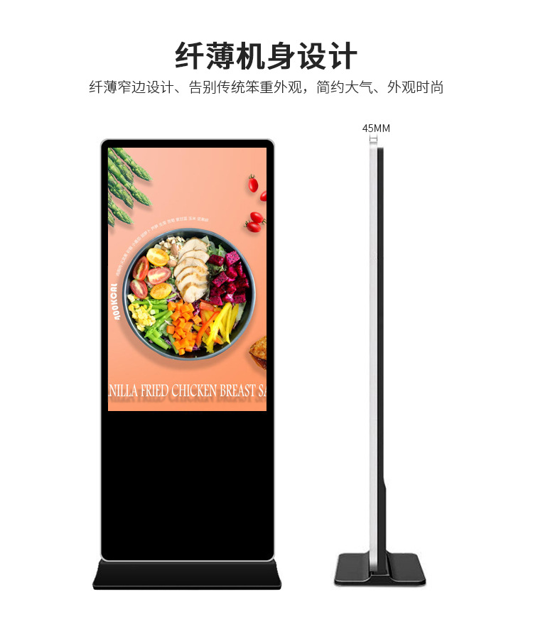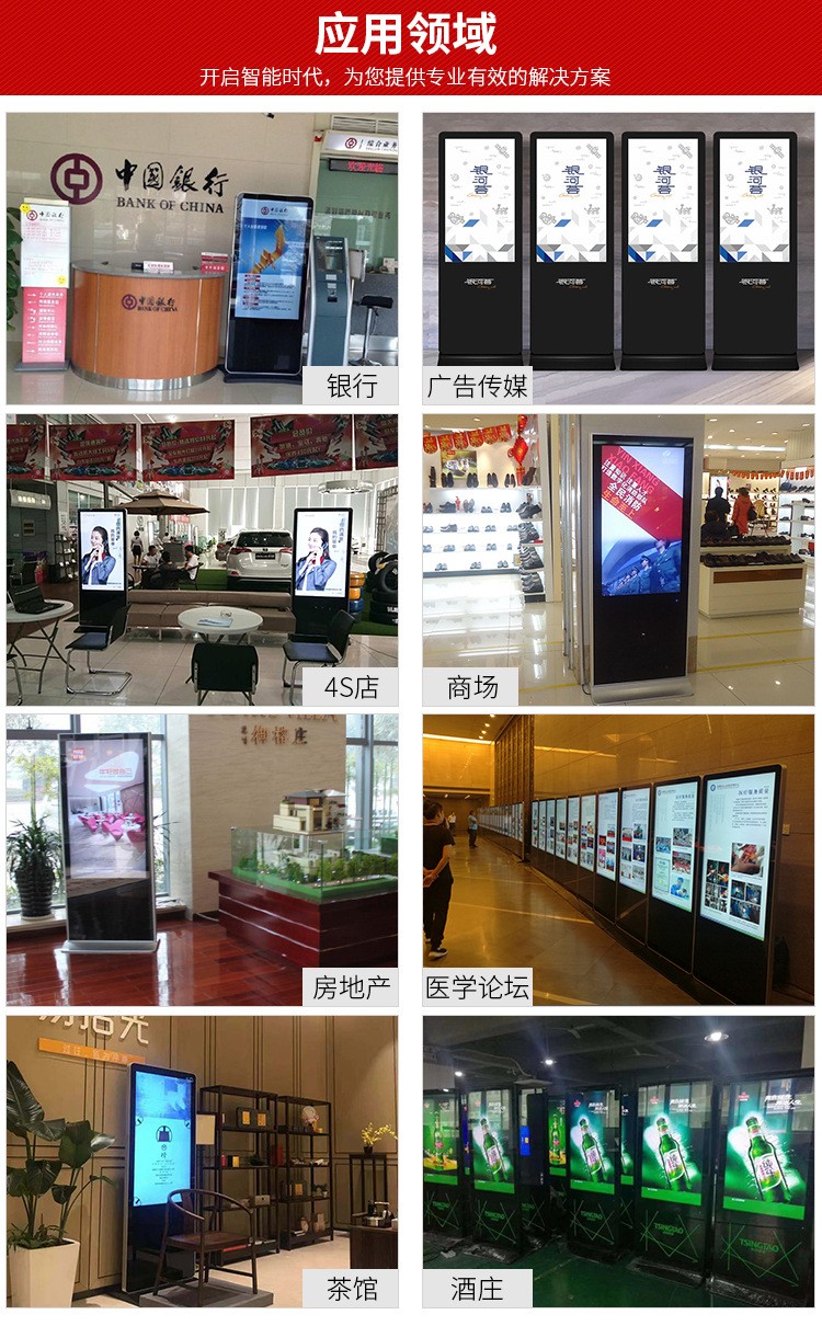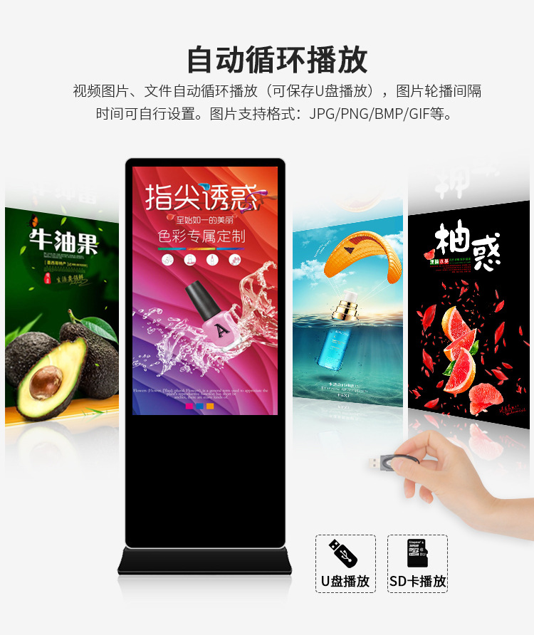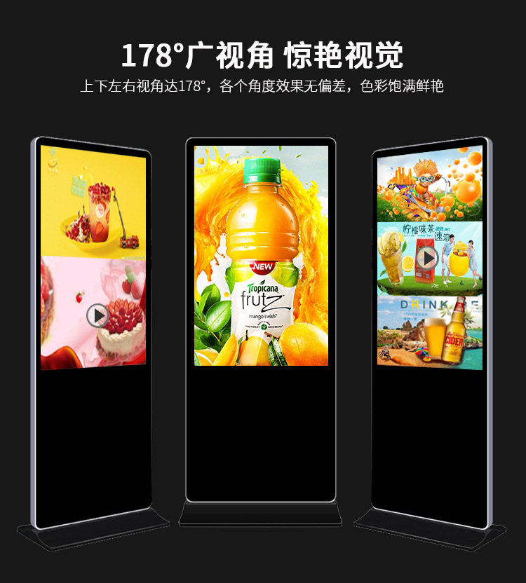 50寸立式液晶廣告機系列產品屬于壁掛、落地式數字標牌廣告機,外觀優美,全身五金冷軋鋼板噴涂,邊條鋁合金型材,面板4MM專用鋼化玻璃,橫式16:9液晶屏,高清效果。內屏采用三星、LG原裝工業級液晶屏,配以最先進的密集型LCD光源背光系統,背光色彩還原度好,超高對比度,強光下依然清晰無比。特別適合高端品牌的綜合多媒體技術,向消費者傳遞全方位的產品信息,促銷信息等。提升產品在銷售終端的顯現率和陳列效果,刺激沖動性購買。相比于其他傳統媒體和促銷方式,投入極低廉,性價比極高。