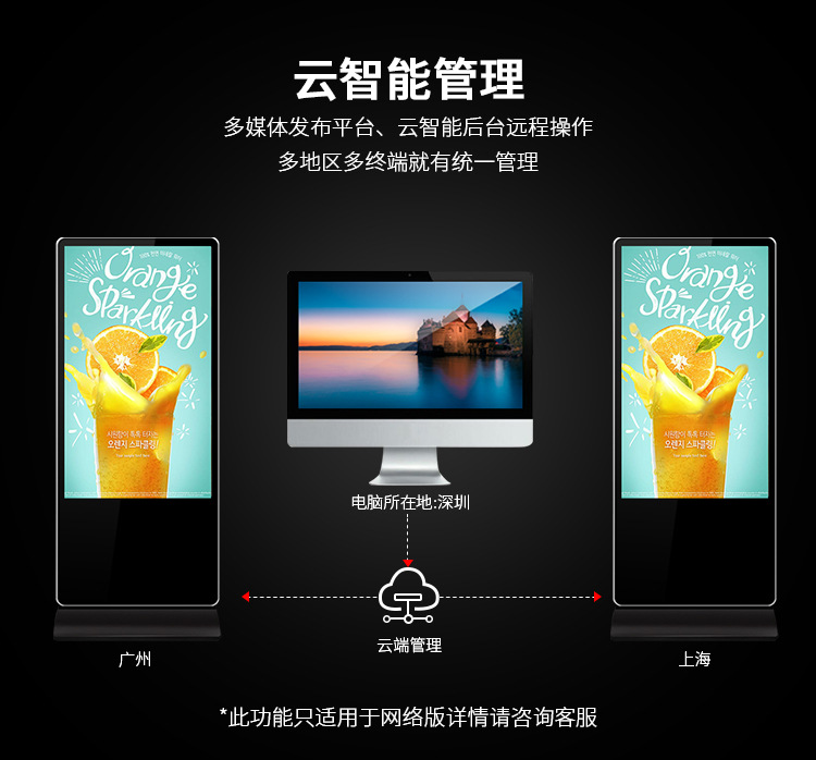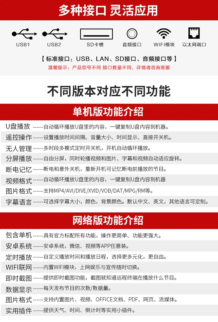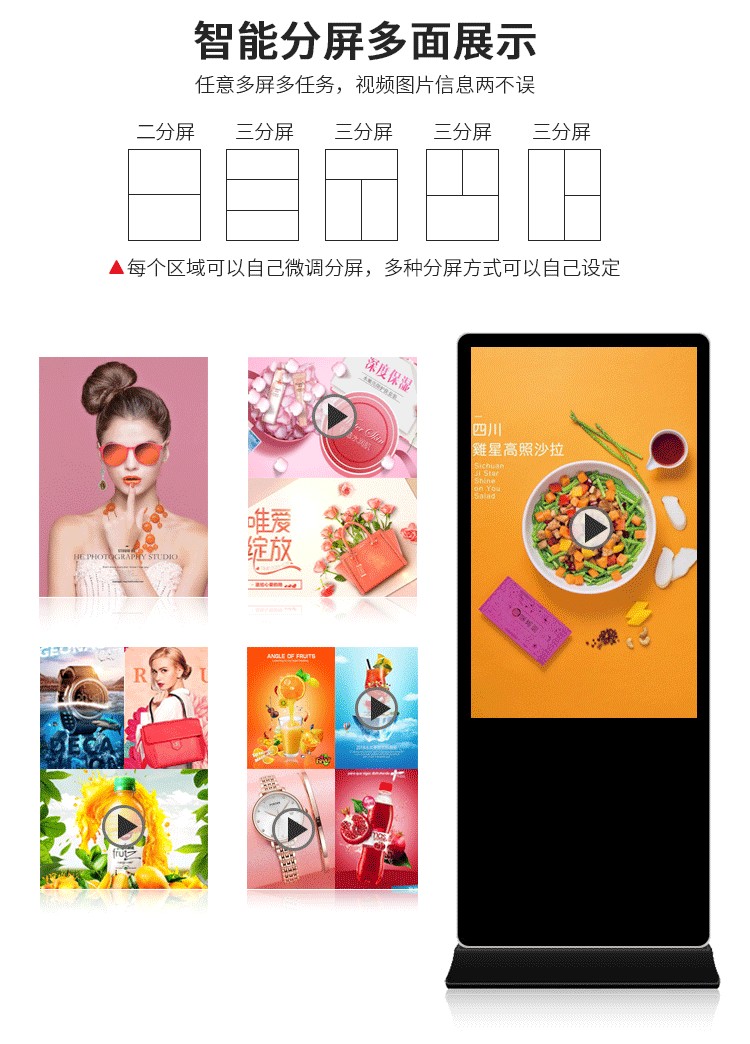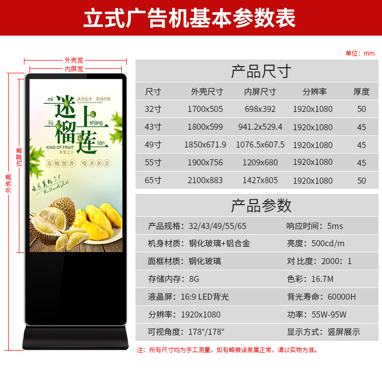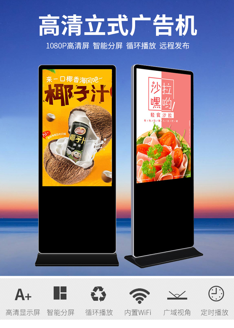 50寸立式液晶廣告機系列產品屬于壁掛、落地式數字標牌廣告機,外觀優美,全身五金冷軋鋼板噴涂,邊條鋁合金型材,面板4MM專用鋼化玻璃,橫式16:9液晶屏,高清效果。內屏采用三星、LG原裝工業級液晶屏,配以最先進的密集型LCD光源背光系統,背光色彩還原度好,超高對比度,強光下依然清晰無比。特別適合高端品牌的綜合多媒體技術,向消費者傳遞全方位的產品信息,促銷信息等。提升產品在銷售終端的顯現率和陳列效果,刺激沖動性購買。相比于其他傳統媒體和促銷方式,投入極低廉,性價比極高。